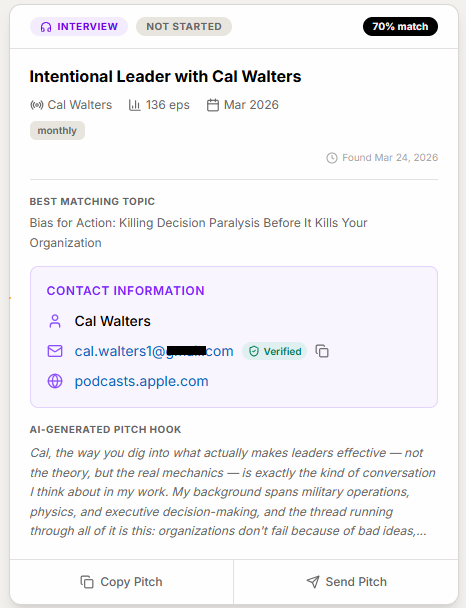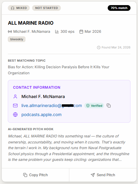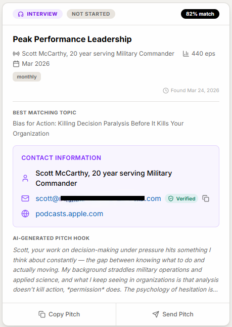 The Scout scans conferences, summits, and podcasts across your niche. It extracts verified decision-maker contacts, scores each opportunity against your profile, and writes a personalized pitch — all automatically.